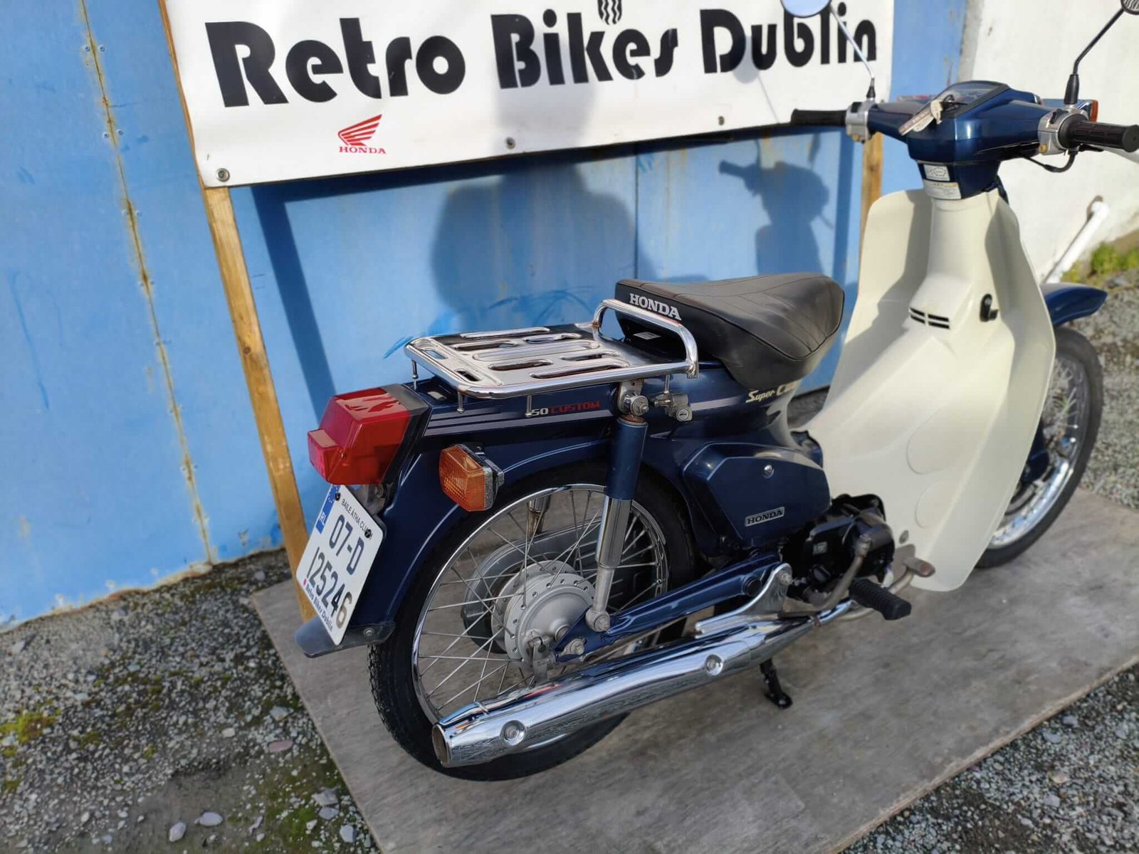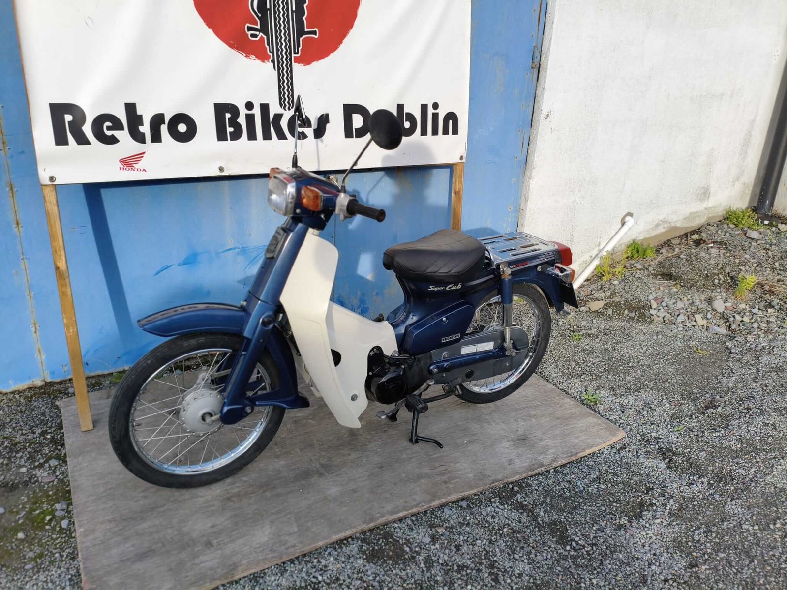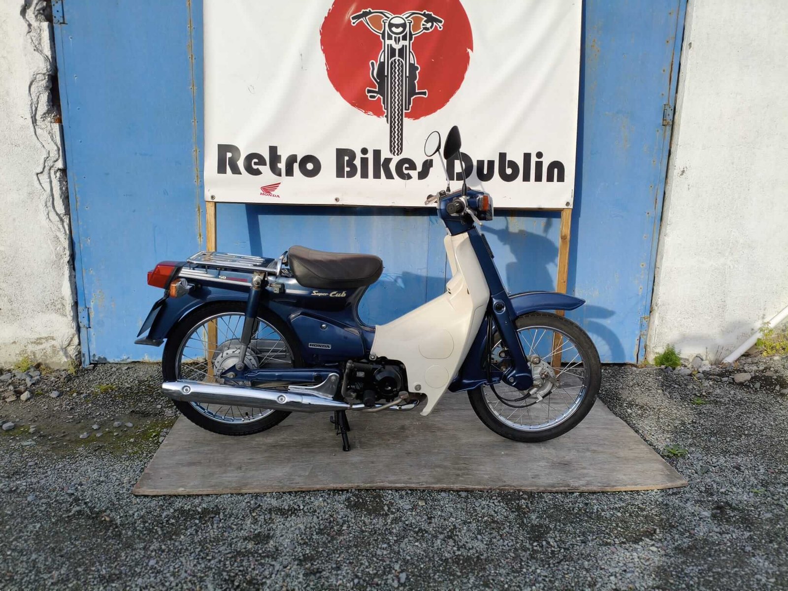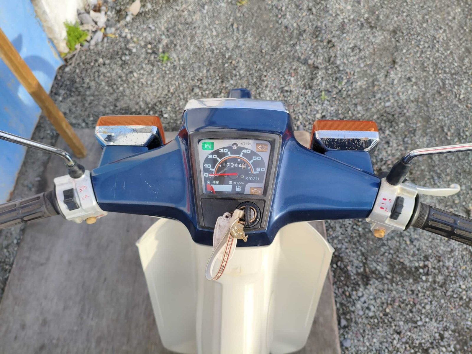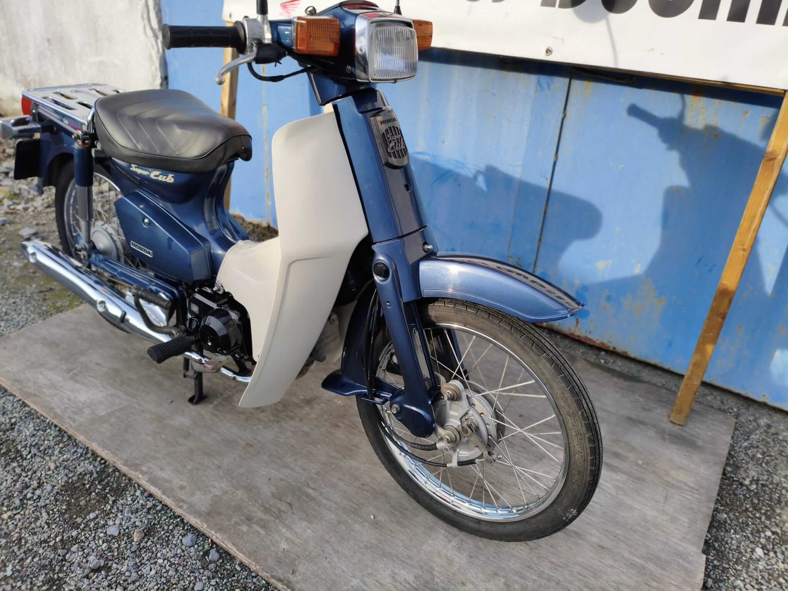 Instantly recognizable, the Super Cub’s “underbone” step-through frame is the definition of practical, user-friendly design. This model, finished in a beautiful deep blue and white, is a perfect example of this timeless look. It features the signature leg shields for weather protection, a sturdy rear luggage rack for practicality, and a simple, easy-to-read dashboard with a clear speedometer and, crucially for this model, a fuel gauge.