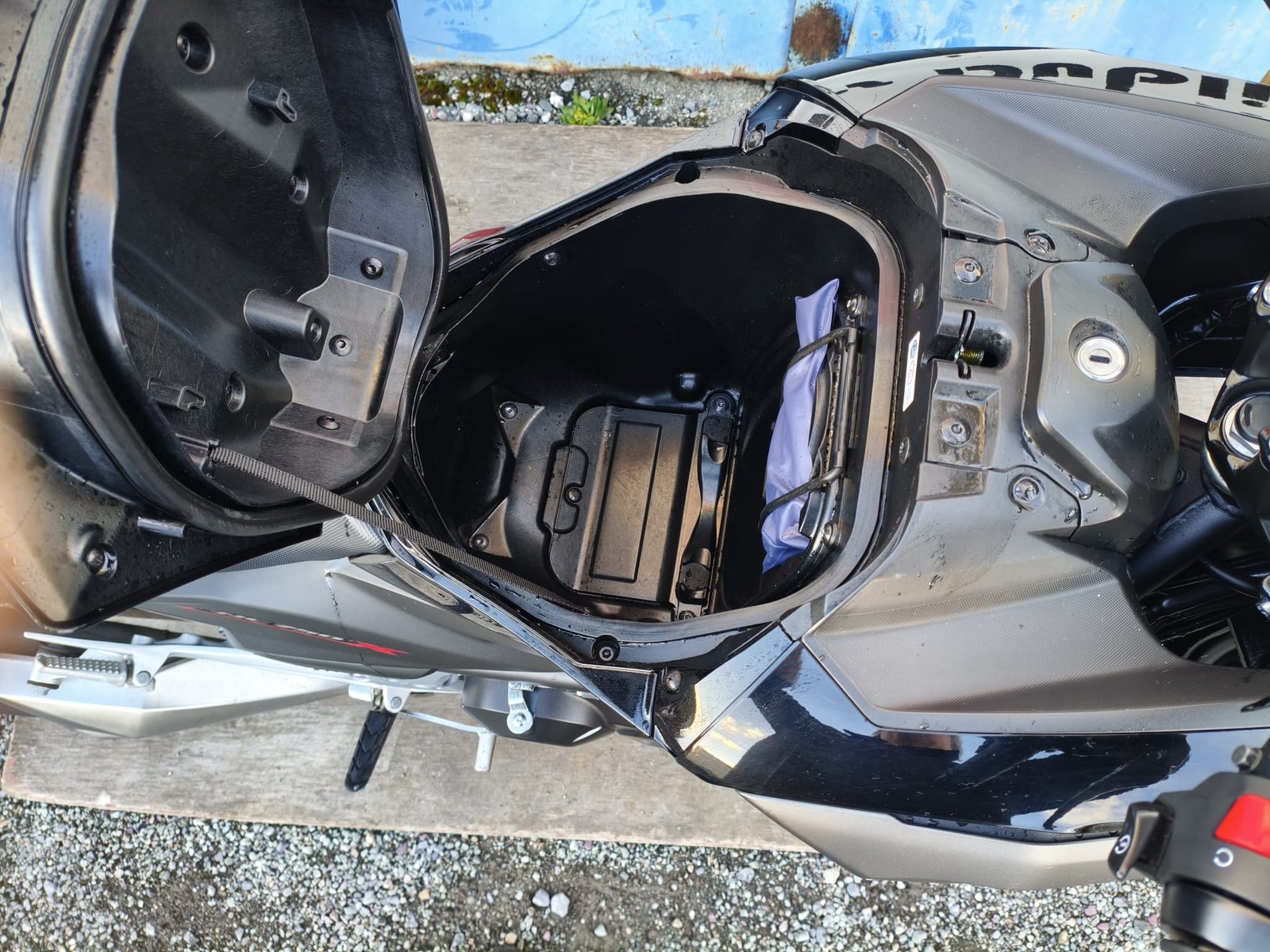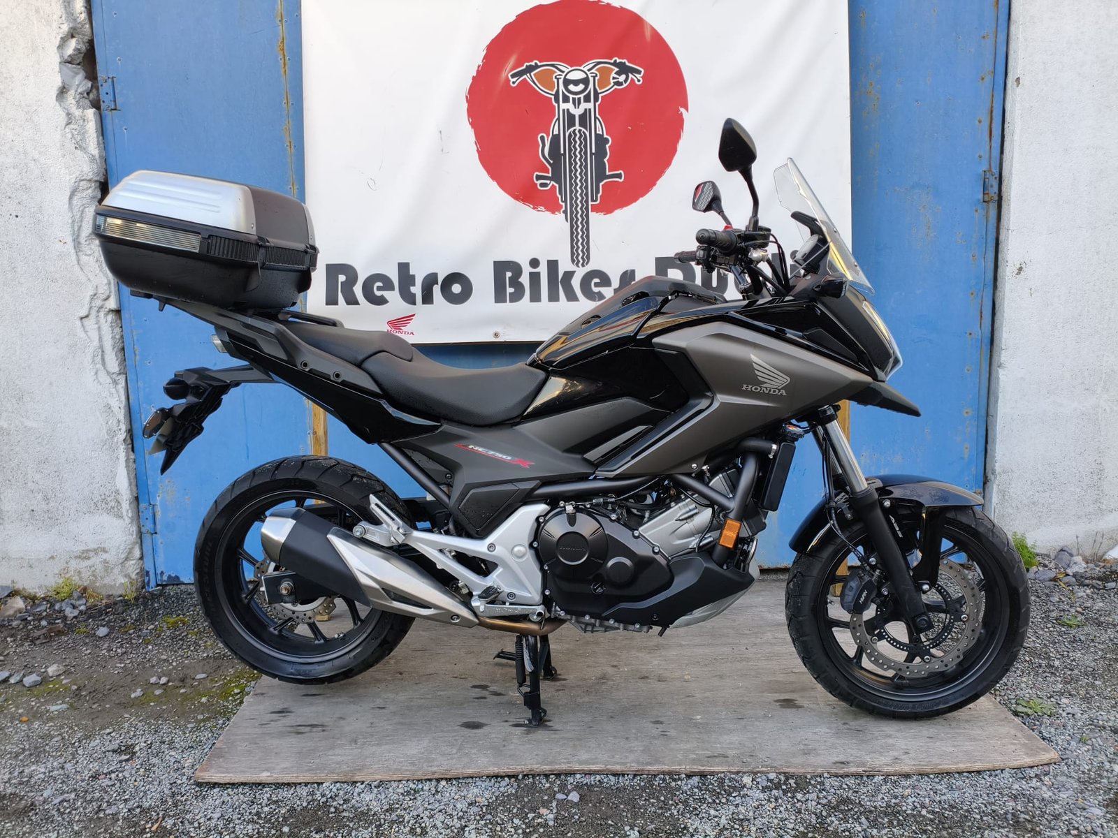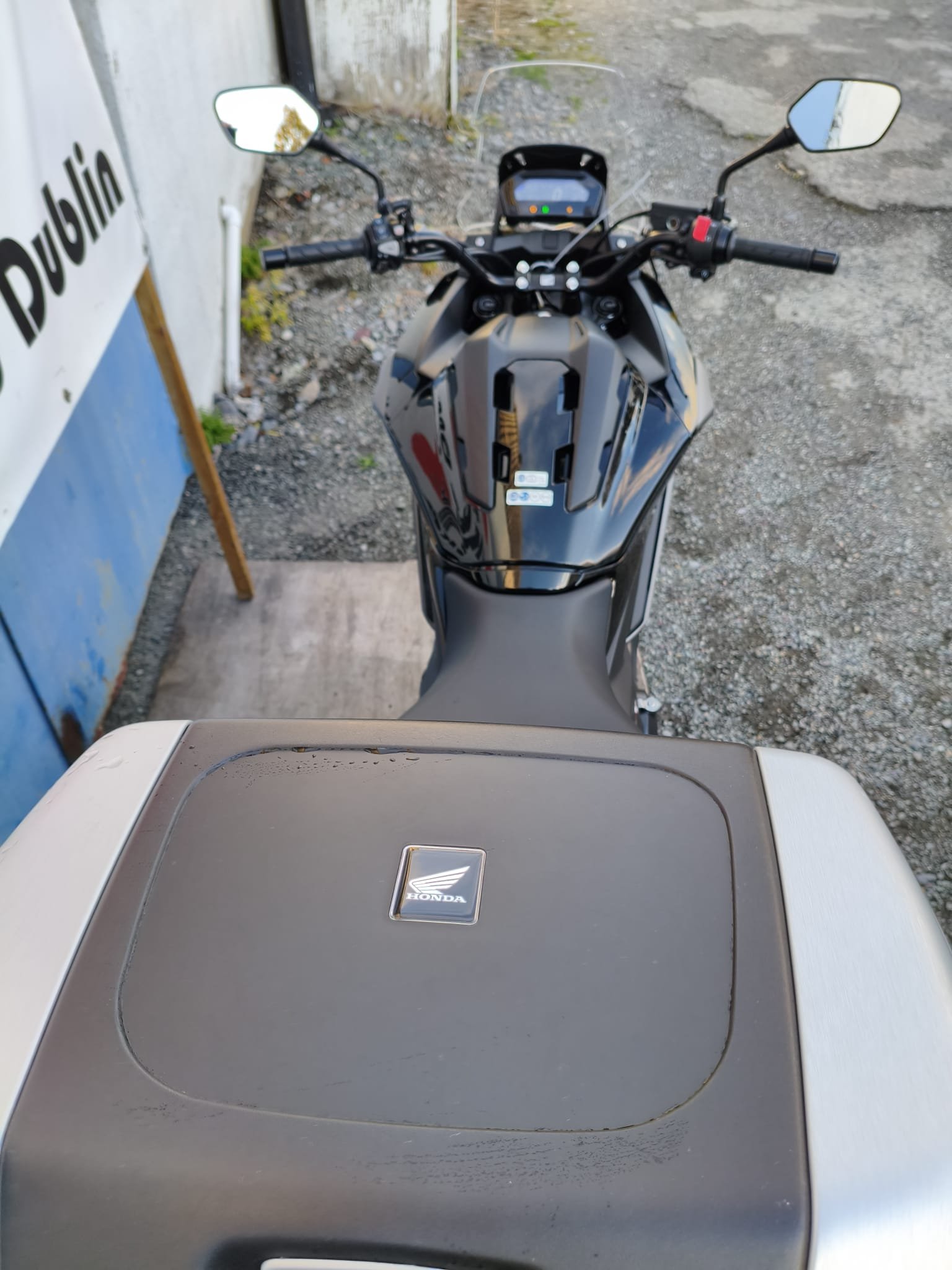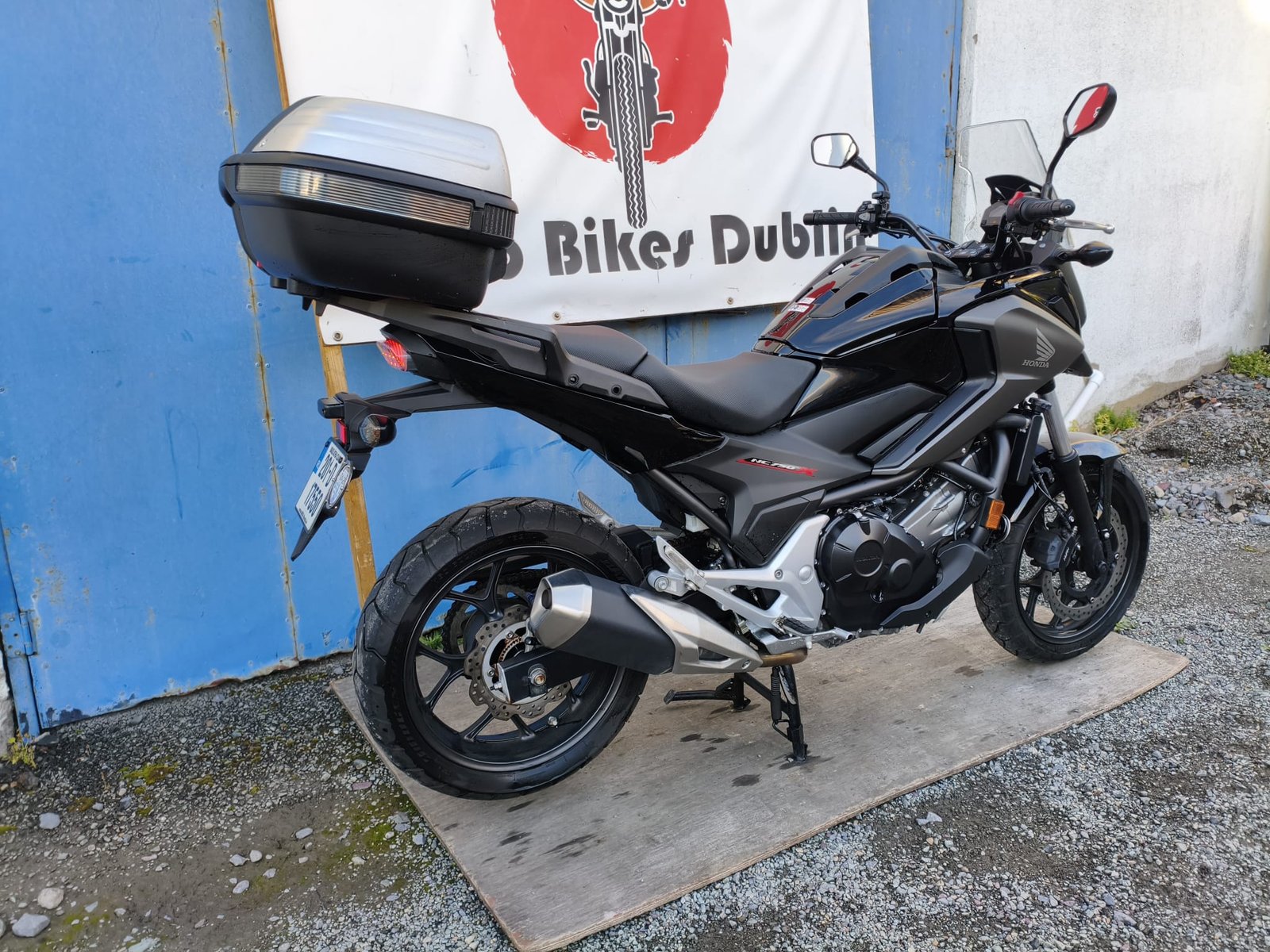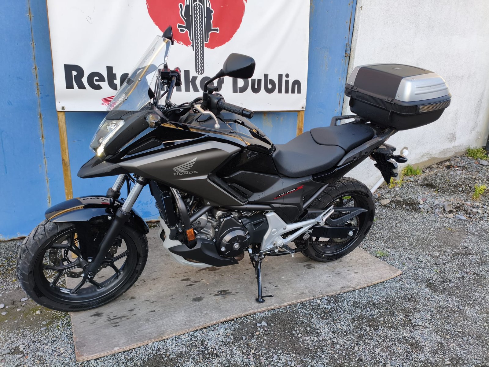 The NC750X features sharp, modern, adventure-bike styling with a commanding, upright riding position and a protective windscreen. This model, finished in a sleek metallic black and grey, is also equipped with a large rear top box and a center stand, adding to its immense practicality. Its most ingenious feature, however, is the 22-litre storage compartment located where the fuel tank would normally be—large enough to fit a full-face helmet.