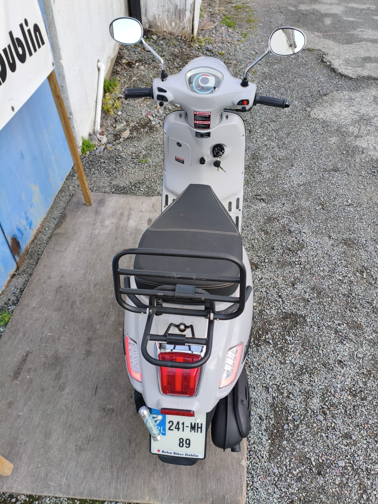 The Dinno 125 is all about style. Its flowing, classic bodywork pays homage to the iconic scooters of the 1960s, while modern touches like the sleek LED indicators and blacked-out wheels give it a fresh, contemporary edge. The comfortable stitched seat, classic round mirrors, and practical rear luggage rack complete the look, making it as functional as it is fashionable.